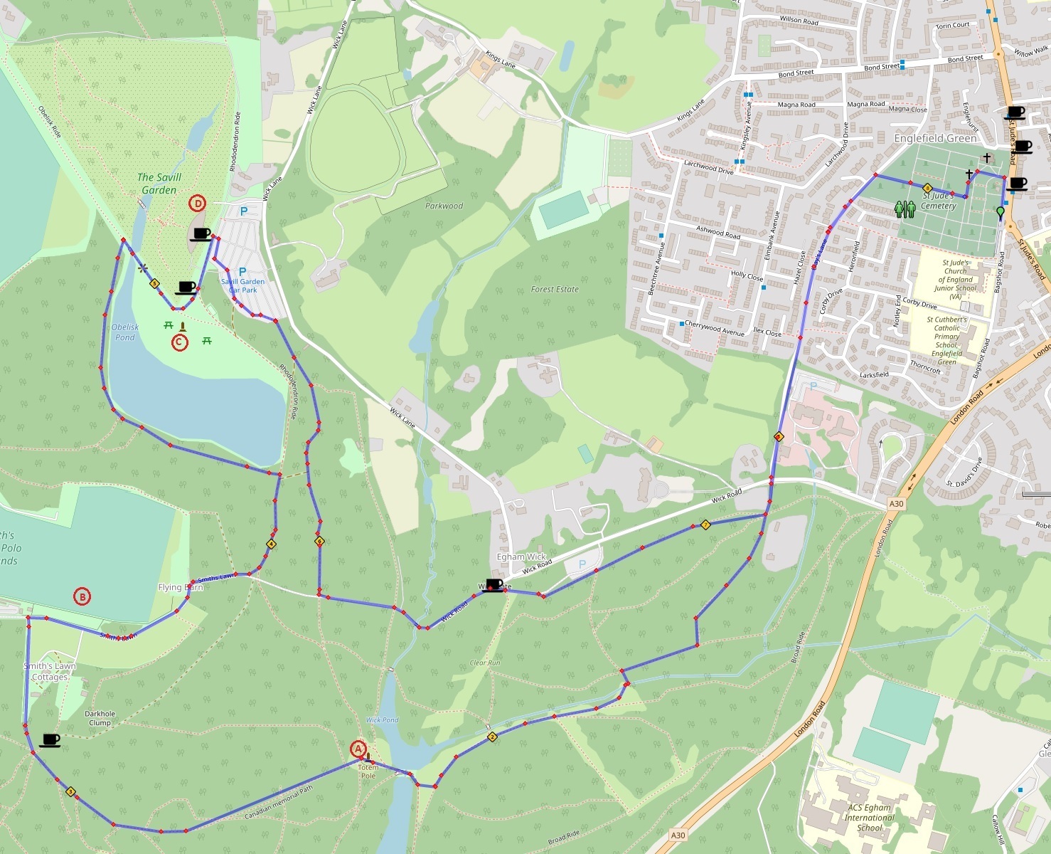 Distance: 8Km Difficulty: Easy. Mainly flat gravel tracks. Accessibility: Good, but some uneven tracks. Facilities: Cafés in Englefield Green and along the route in Windsor Great Park. Toilets in EG Cemetery maintenance building and signposted along the route. Start Point: Car park at southern end of St Jude’s Rd TW20 0BY.. Printable Version ----------------------------------- Directions: From the carpark head towards the church and enter the cemetery through main gates. Follow the path straight ahead and take the left-hand path just before the small chapel (Greek Orthodox Church of St. Andrew the Apostle) then the first path on the right will take to the gate at the opposite side of the cemetery. Here turn left down Blays Lane and follow the lane with caution down to a T’ junction with Wick Rd. Cross the road and enter Windsor Great Park by the pedestrian gate opposite. Head straight past a few houses on the left, at first on tarmacked track and then carry on along the gravel track. Follow the track round to the left and at the ‘T junction turn right. When reaching a crossroads of tracks, turn left across a (partially concealed stream) and follow the track to the right alongside the stream Passing a wooden footbridge, carry on until you reach a causeway on the right which separates Wick Pond from Virginia Water Lake. Cross the causeway towards the 100ft tall Totem Pole (A) which was gifted in 1958 to Queen Elizabeth II from the people of Canada. From the Totem pole proceed straight on along the tree-lined avenue that is The Canadian Memorial Path and into the Valley Gardens. Sticking to the main path, you will find yourself an area where several paths converge. (If you require refreshment or a toilet, then you will find these a short way along the path to the right.) Head diagonally towards the gate in the fence and enter the Heather Gardens – home of the National Heather Collection and follow the meandering pathway and out through the gate to turn right along a track. You will join the roadway here and should be aware of occasional park traffic. Facing you will be Smith’s Lawn (B) – home of the Guards Polo Club where you may be lucky to find an event on. Turn right along the main road alongside the Smiths Lawn Polo Fields and note the Airfield memorial at the corner of the fencing on the left which commemorates the time in 1920s when Smith’s Lawn was a grass airfield. The road turns through two bends and downhill to a waymarked crossroads, where you turn left, signposted Savill Garden. Soon, at the edge of the Obelisk Lake, take the gravel track on the left, which hugs the lake all the way to an open ‘ride’, where you should turn right over a stone bridge. From the bridge you can view part of the famous Savill Garden. Following the track up the hill will take you to an open area to get a closer view of the Obelisk (C) Here refreshments can be bought and there are a few benches and table for customers’ use. Savill Garden visitors’ Centre can be seen to the left and here there are toilets, restaurant, and a gift shop as well as the entrance to the renowned Savill Garden. (D) After your visit, with care walk through the car park along the right-hand side ignoring the first pedestrian walkway and then at the far end you should exit into a pathway. (This path has the potential to get muddy). Carry on until you emerge on to the tarmacked road and turn left down to a stream and then up towards Butcher’s Gate where you can find refreshment at The Bailiwick dining pub. Follow the road in the park in the same direction, to pass a carpark on the left and then to reach the gate you used to enter the park. From here retrace your steps along Blays Land and through the cemetery to the start of the walk. Printable Version